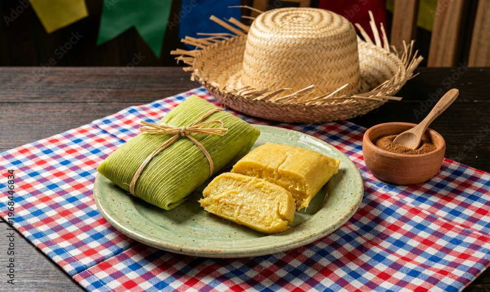 Pamonha brasileira tradicional em prato rústico com chapéu de palha e decoração de Festa Junina sobre mesa de madeira #1968446834