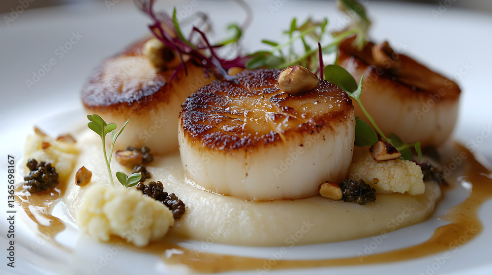 Pan Seared Scallops Saint Jacques with Caramelized Elements and Garnished with Microgreens and Sauce #1365698167