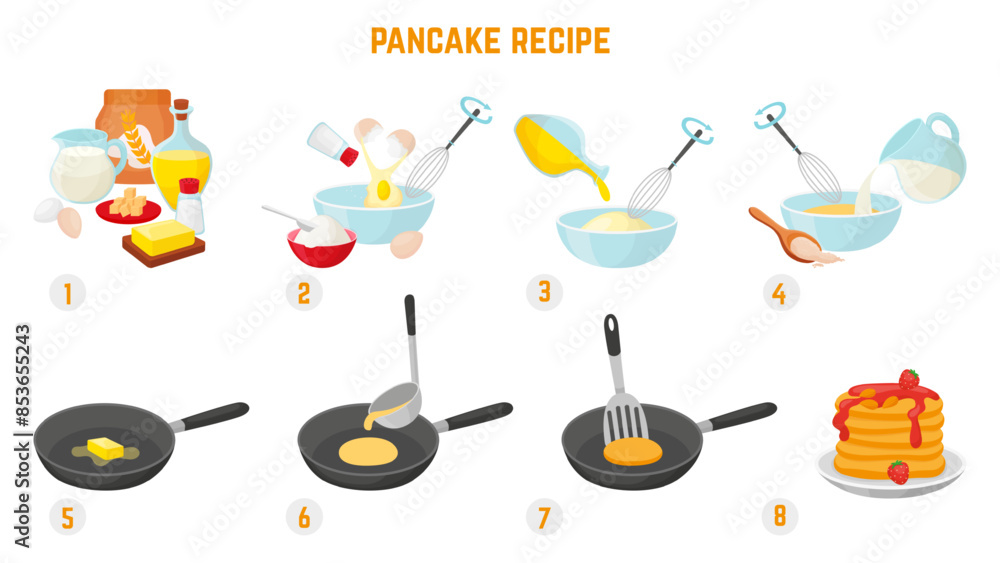 Pancake cooking instruction. Baking steps recipe for sweet tasty breakfast. Cook on pan, mixing raw ingredients. Homemade baked neoteric vector process #853655243