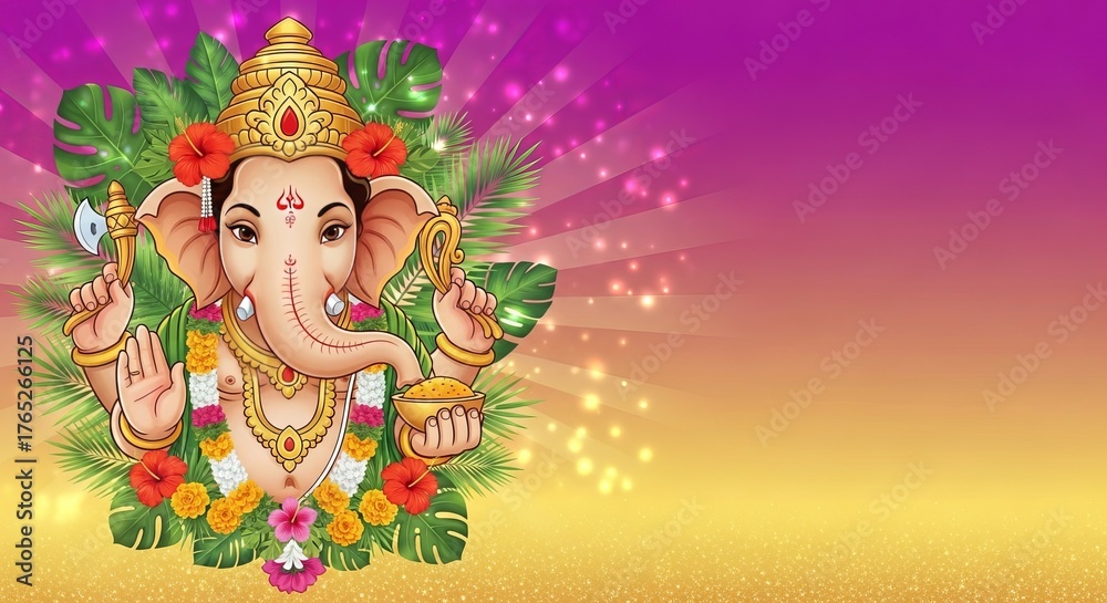 Pancha Ganapati radiant gradient from vivid magenta to gold, Lord Ganesha smiling beneath tropical garlands, sunlight filtering through #1765266125