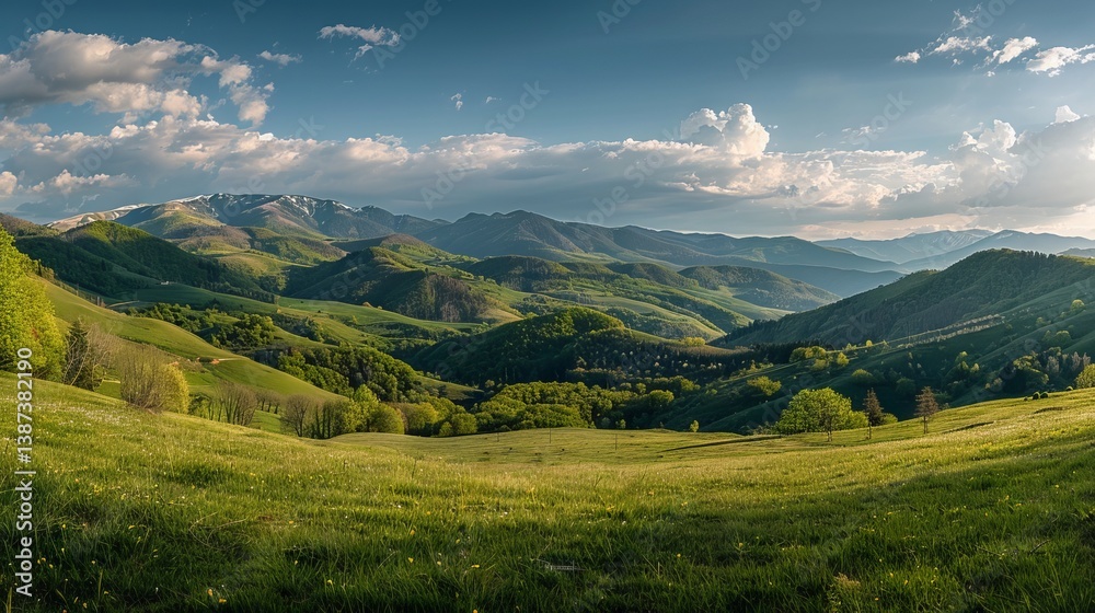 Panorama of rolling hills and grassy meadows in rural romanian mountains #1387382190