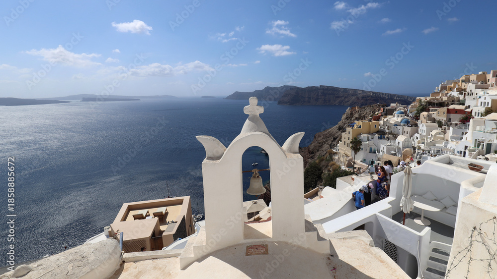 Panorama with white bell tower of Santorini Oia village #1858885672