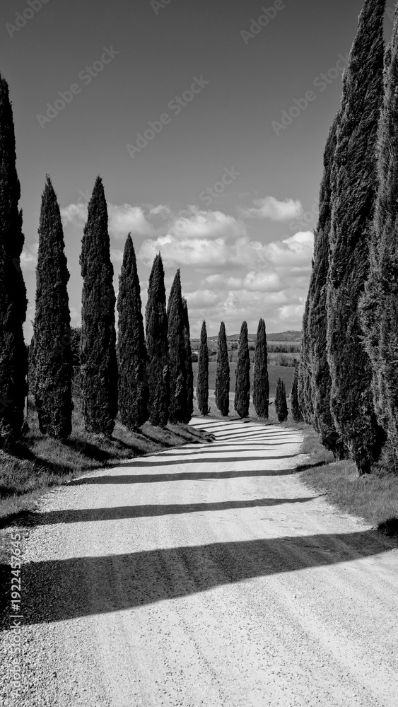 Panorami in bianco e nero della Toscana. Veduta collinare della Val d'Orcia lungo il percorso ciclistico dell'Eroica. Provincia di Siena. Toscana , Italia #1922457645