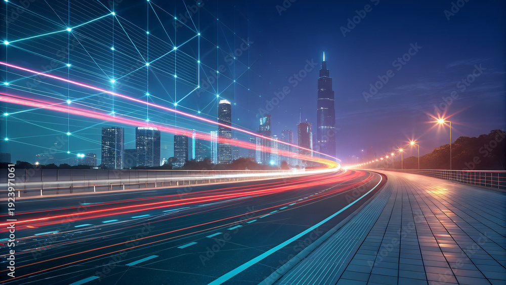 Panoramic abstract technology background with fast light trails and digital grid. Represents high-speed networks and futuristic motion. Great for tech startups or events. #1923971061
