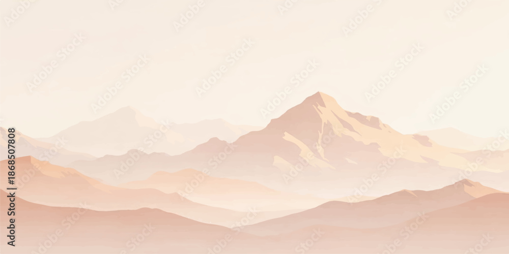 Panoramic mountain range landscape at sunrise with morning mist and fog veiling the peaks and valley under a glowing sky #1868507808