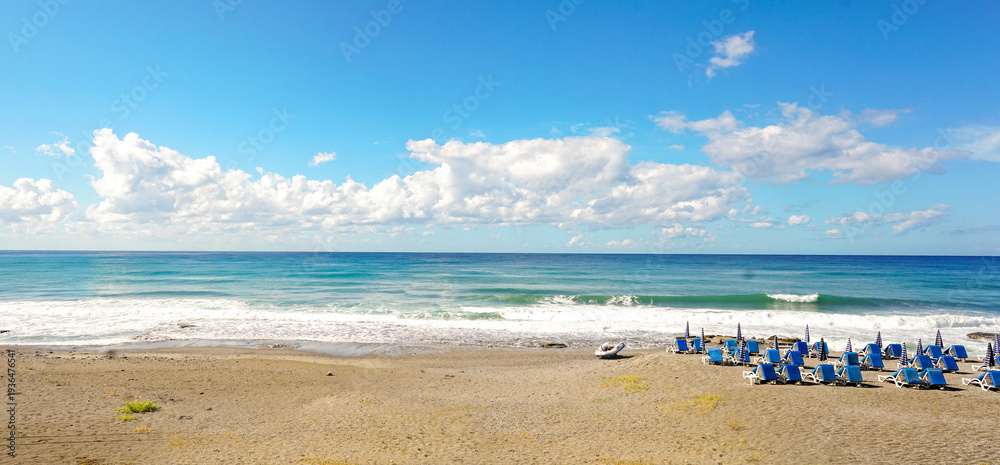 Panoramic shot of a resort beach featuring a neat row of blue sunbeds and umbrellas on the shore. Bright blue sky and clear turquoise water highlight the perfect coastal nature escape. #1936476541