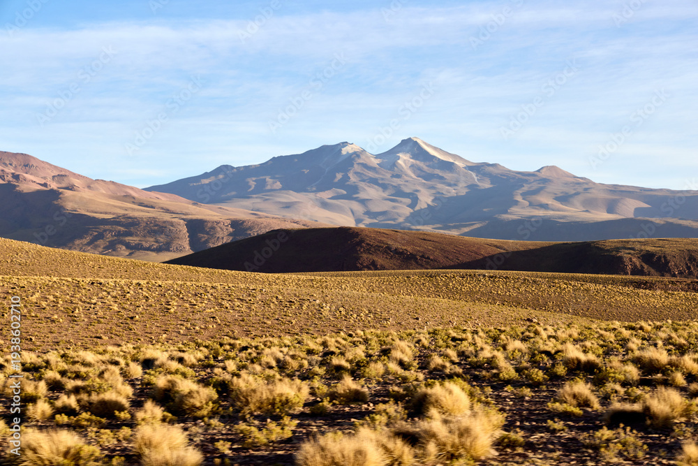 • #1938602518 Expansive altiplano shows golden dry grass covering the foreground. Majestic mountains rise in the distance beneath a bright, clear blue sky in Bolivia.