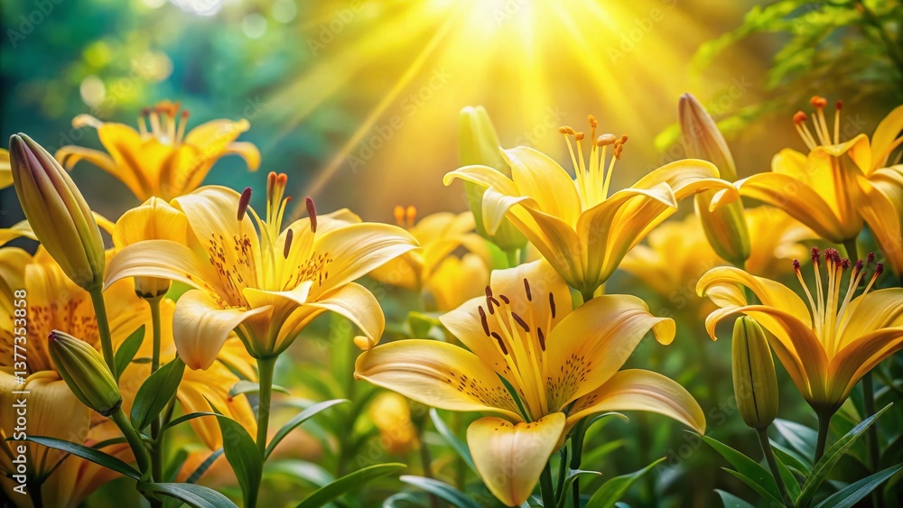 Panoramic View of Blooming Yellow Lilies in a Lush Garden #1377353858