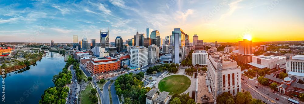 Panoramic view of Nashville skyline at sunset with river, skyscrapers, and city landmarks #1702884308