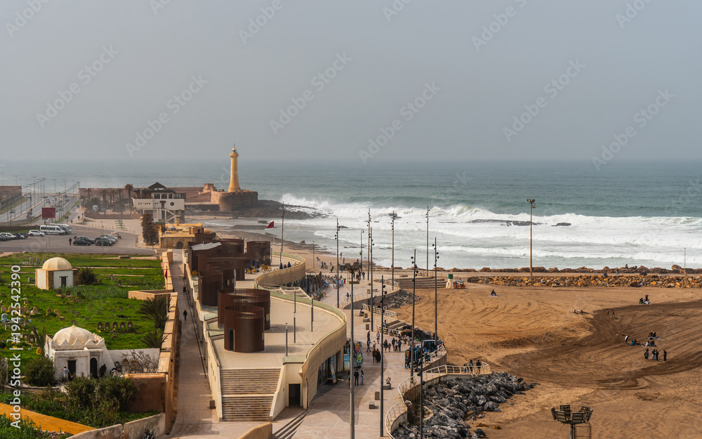 Panoramic View of Rabat Coastline with Lighthouse and Public Beach #1942542390