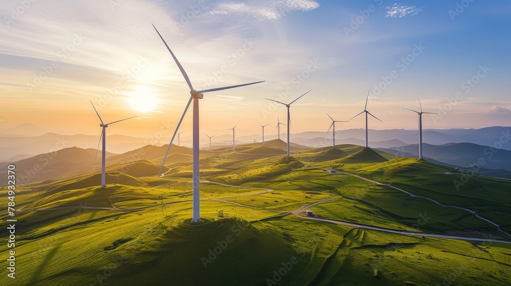 Panoramic view of wind farm or wind park with high wind turbines for generation electricity, Wind Energy And Technology, Green energy concept #784932370