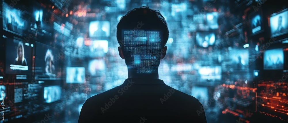 Panoramic visualization of a person's online identity being hijacked and manipulated by AI-powered impersonation #981079433