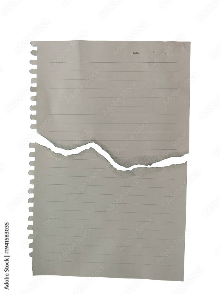 Papel de caderno branco rasgado ao meio, revelando linhas azuis e furos de espiral. Textura realista, isolada em fundo neutro, ideal para mockups, colagens e designs gráficos. Alta resolução e detalhe #1941563035