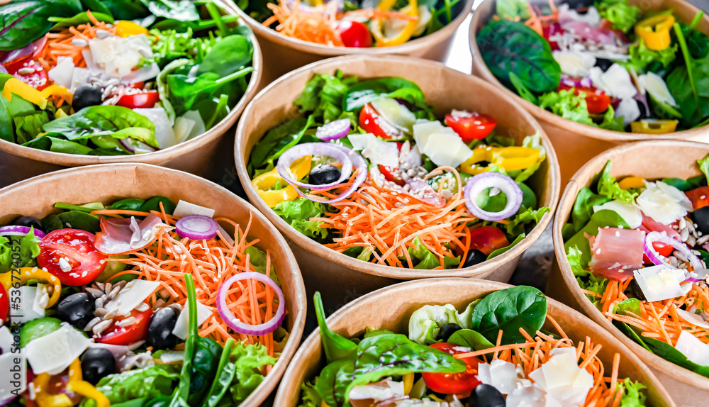 Paper boxes with pre-packaged vegetable salads ready for sale #536724052
