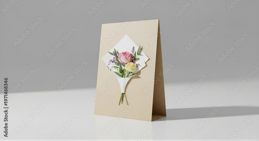 paper card with floral bouquet design, minimalist stationery on white surface #1971468346