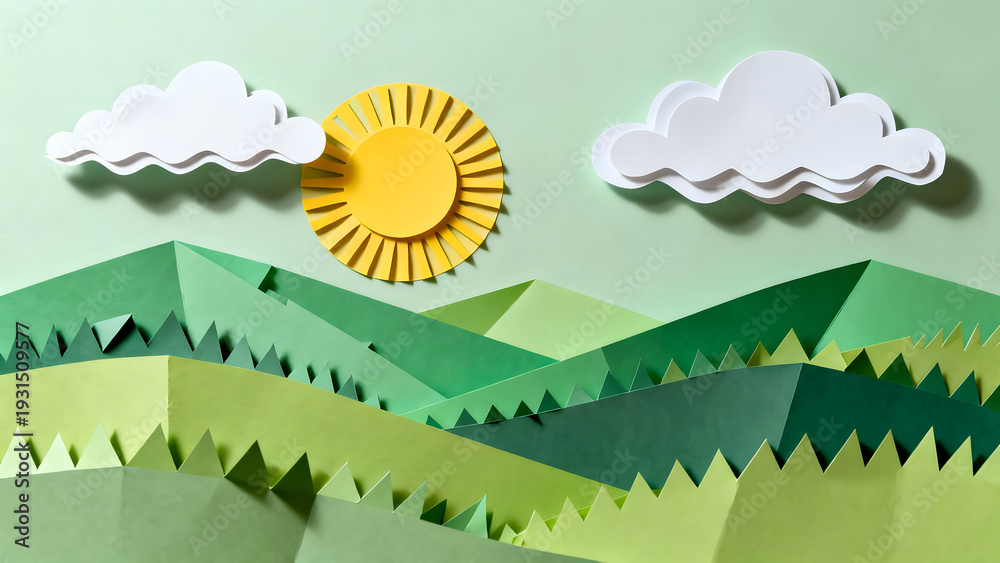 Paper Cutout Landscape: A charming and vibrant paper cutout scene of rolling hills, puffy clouds, and a radiant sun, all crafted from colorful paper, evoking a sense of tranquility and whimsy. #1931509577