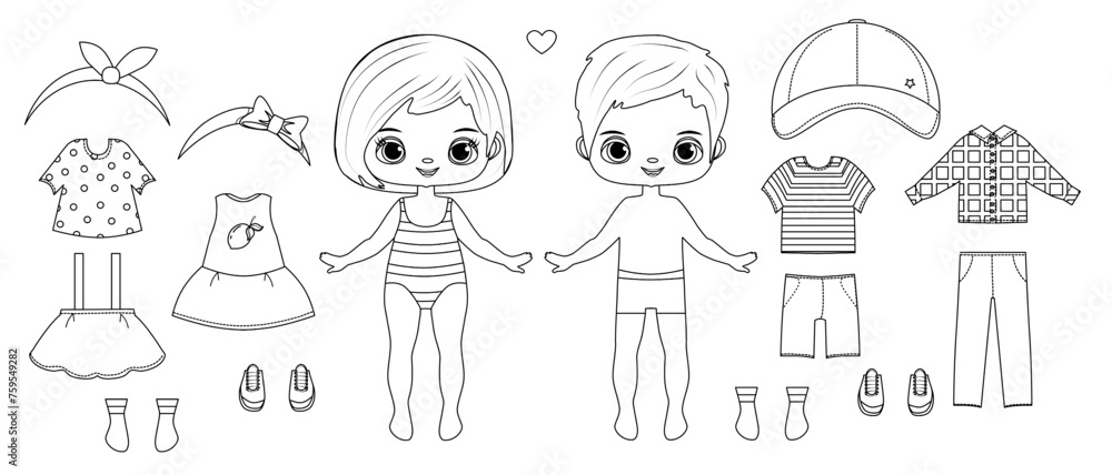 Paper doll outline. Paper doll clothes. Boy, girl, baby. Coloring page, Coloring book. Cute girl with clothes. Vector illustration isolated on white background. Dress up, cutouts, cut out. Toy, game #759549282