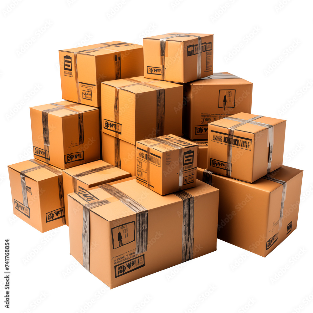 Paqueteria y envio de mercancia.Compras on line. Pila de cajas de cartón aisladas sobre fondo transparente. #741768854