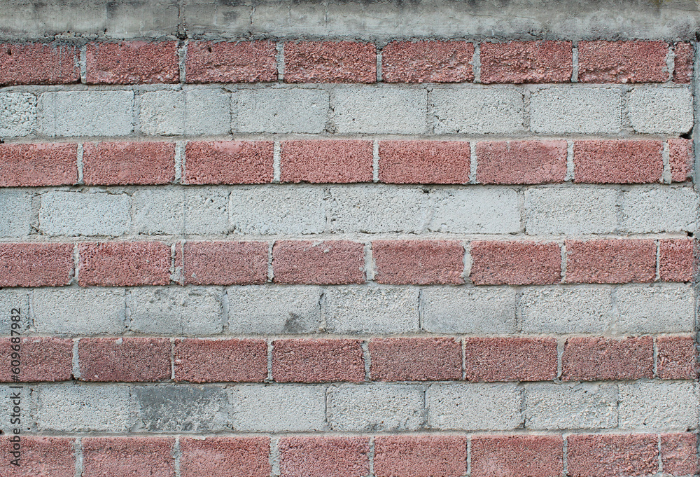 Pared con hileras de ladrillo rojo y gris. #609687982
