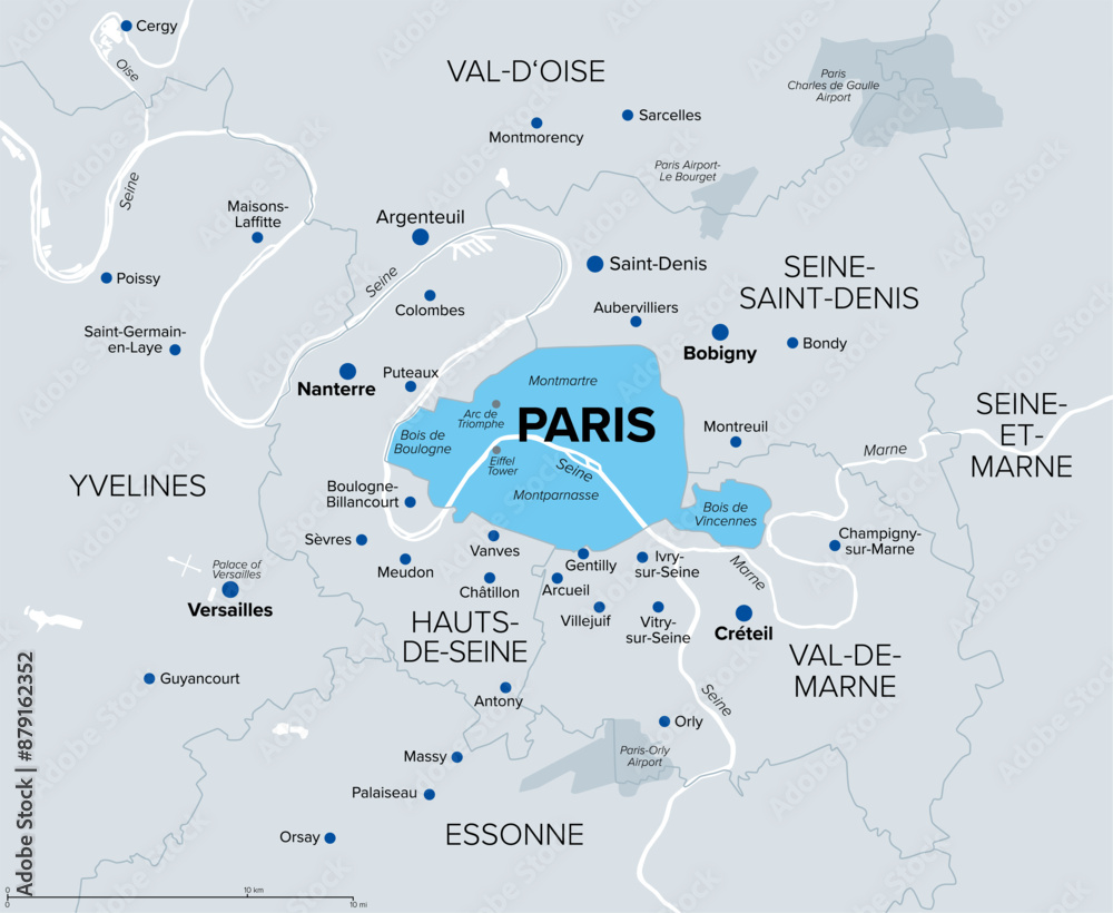 Paris, department and capital of France, political map. Part of Ile-de-France, with Petite Couronne, the inner ring, formed by 3 departments bordering Paris, forming a geographical crown around it. #879162352
