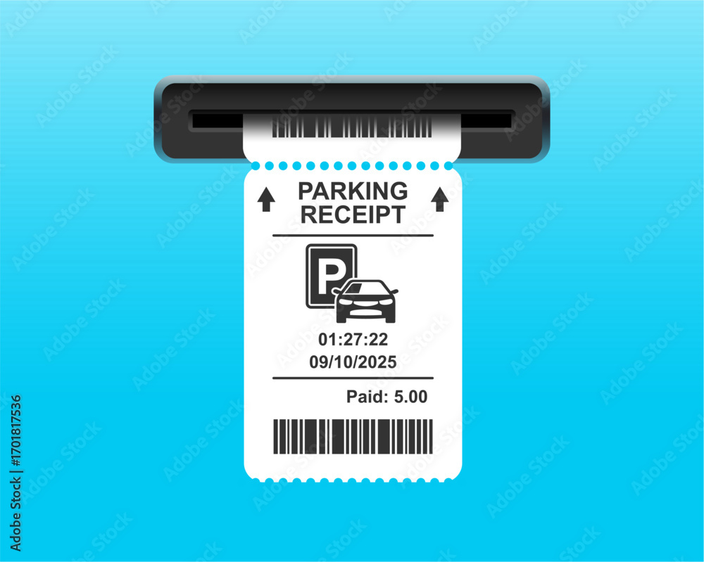 Parking ticket for car. Paper receipt in pay machine on exit. terminal before barrier, for payment of bill or tax. Icon of invoice for park zone. Vector. #1701817536