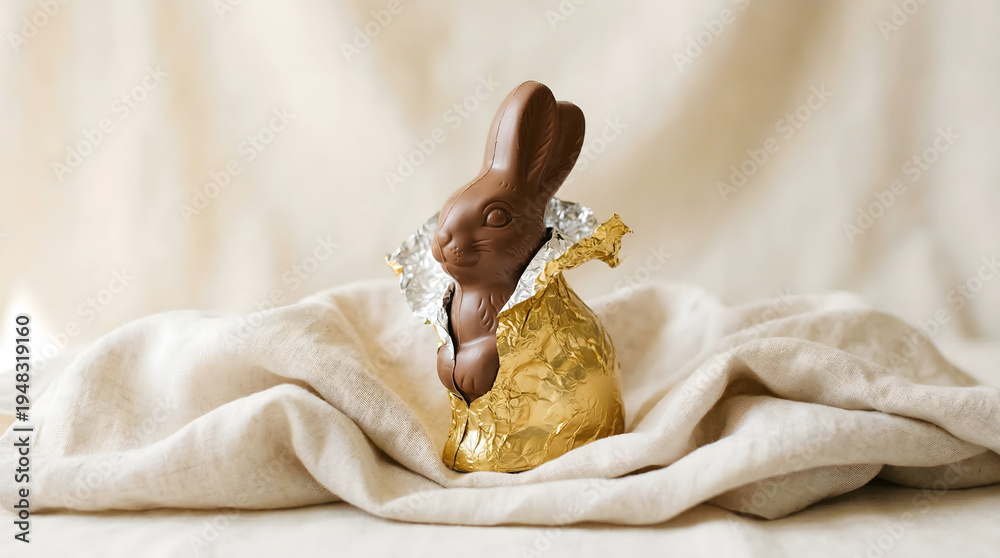 Partially unwrapped chocolate Easter bunny placed on soft fabric with gentle natural lighting creating a cozy festive feel #1948319160