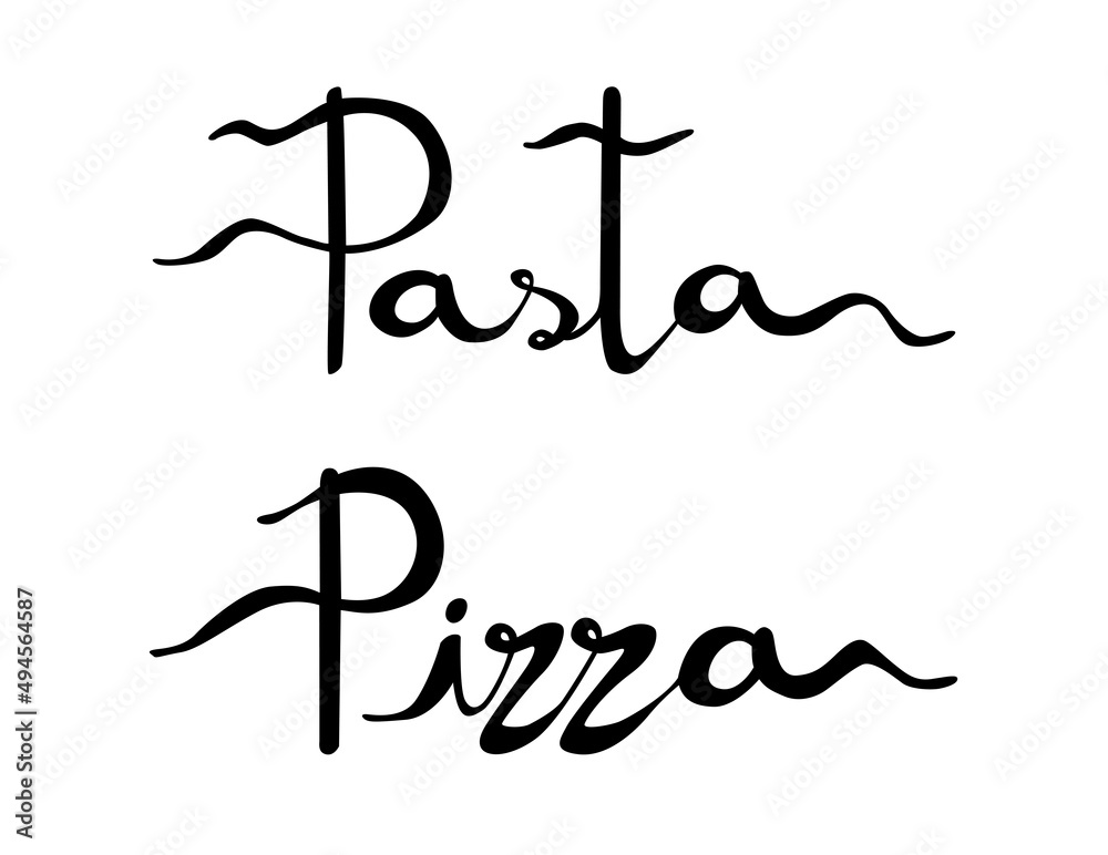 Pasta, Pizza; diseño de texto escrito a mano en negro. Recurso grafico sobre fondo blanco #494564587
