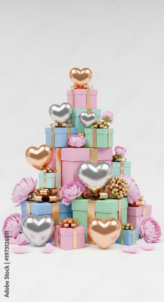 Pastel colored gift boxes with gold ribbons and heart balloons mother's day background wallpaper poster banner download 2026 2027 #1973126811