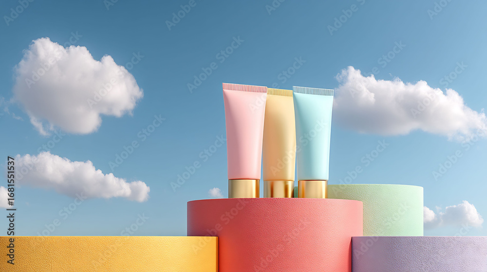 Pastel cosmetic tubes product mockup on colorful podiums with blue sky background #1681551537