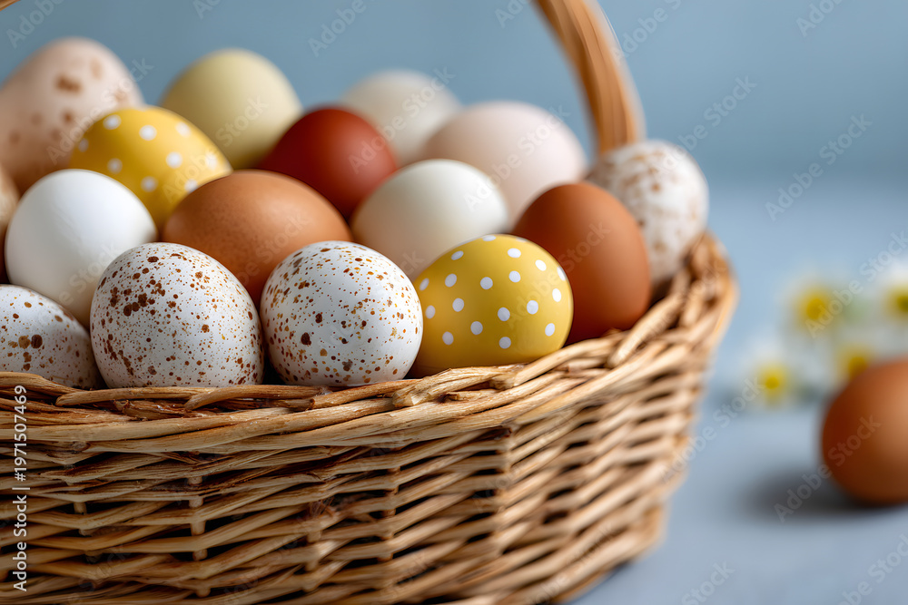 Pastel easter eggs in a wicker basket ready for an egg hunt during spring celebrations #1971507469