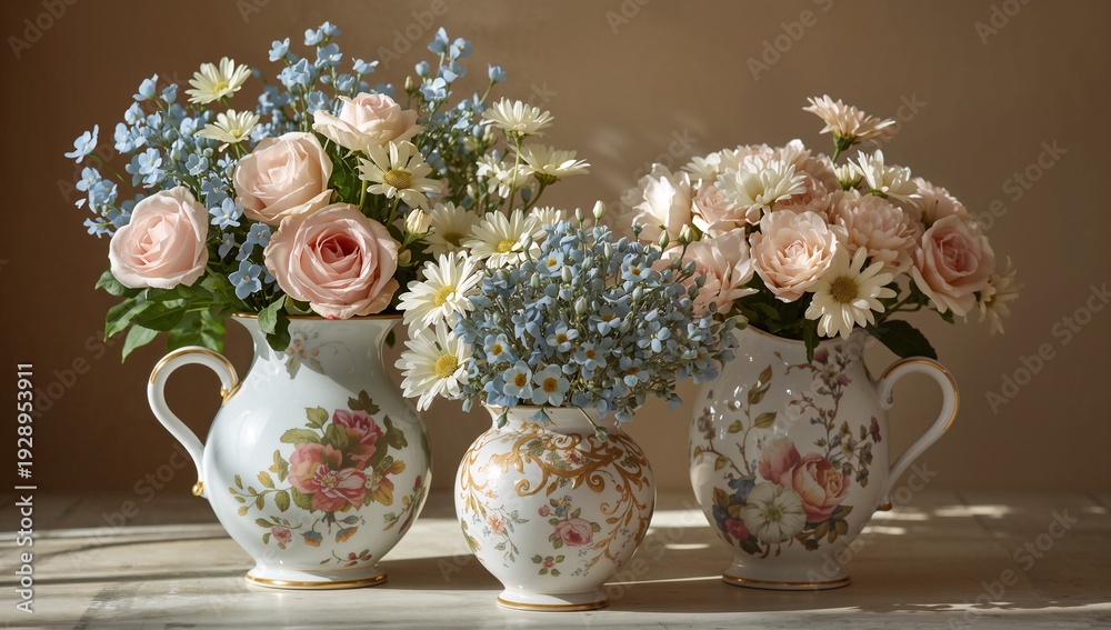 Pastel garden blooms styled in vintage ceramic vases #1928953911
