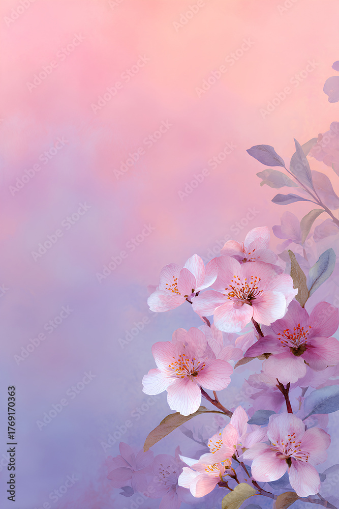 Pastel gradient sky in watercolor blending lavender pink and mint with blooming peonies and cherry blossoms evoking feminine strength and renewal #1769170363