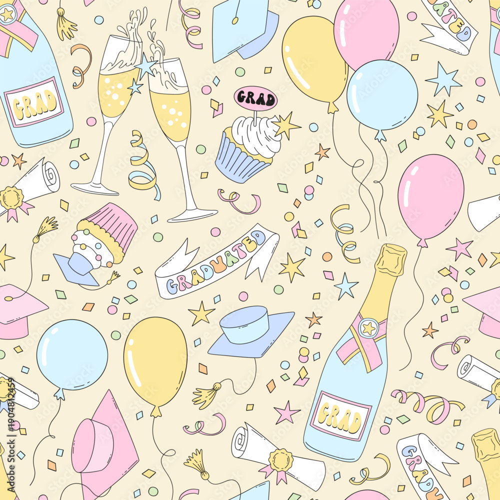 Pastel graduation seamless pattern with balloons, caps, champagne, and confetti in retro style #1904812459