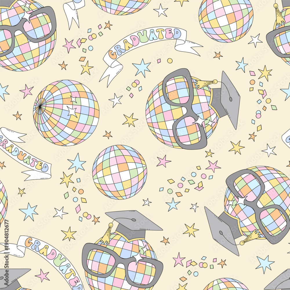 Pastel graduation seamless pattern with disco balls, stars, and confetti in retro style #1904812677