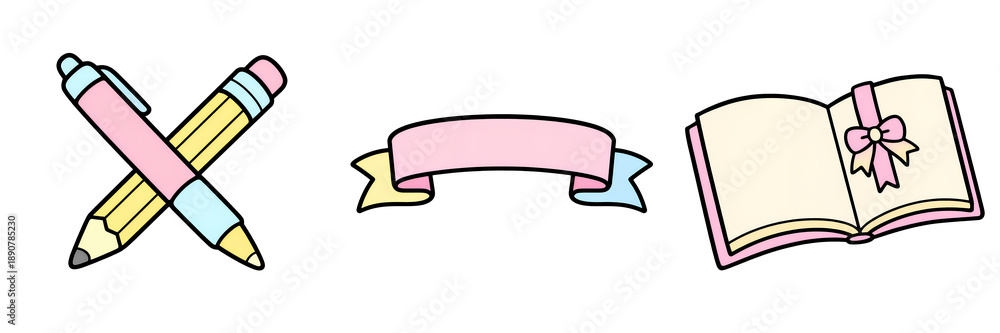Pastel pen pastel pencil ribbon banner open book cute vector kawaii stationery pink yellow soft color flat design cartoon style happy #1890785230