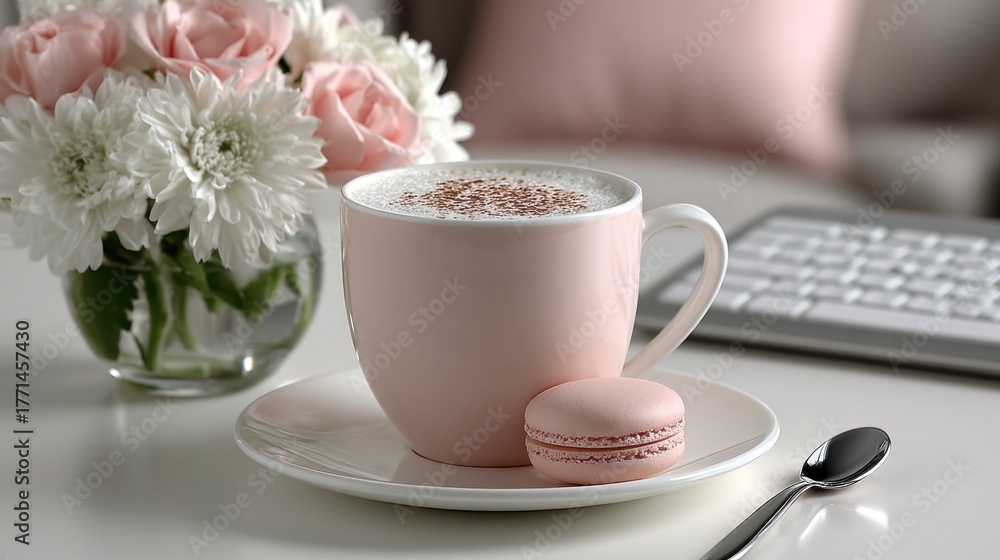 pastel pink cup filled with frothy coffee sits on a saucer next to a delicate macaron. Fresh flowers in a glass vase add charm to a well-lit table with a keyboard in the background #1771457430