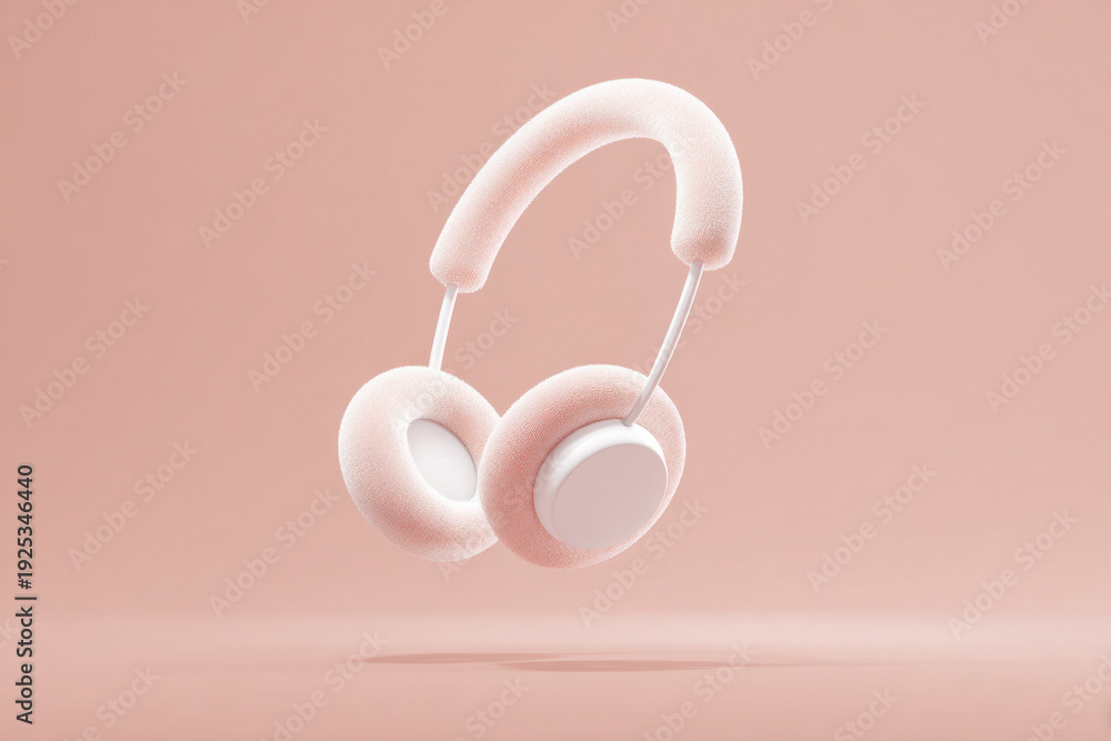 Pastel pink fuzzy 3D headphones with bloated design floating in studio #1925346440