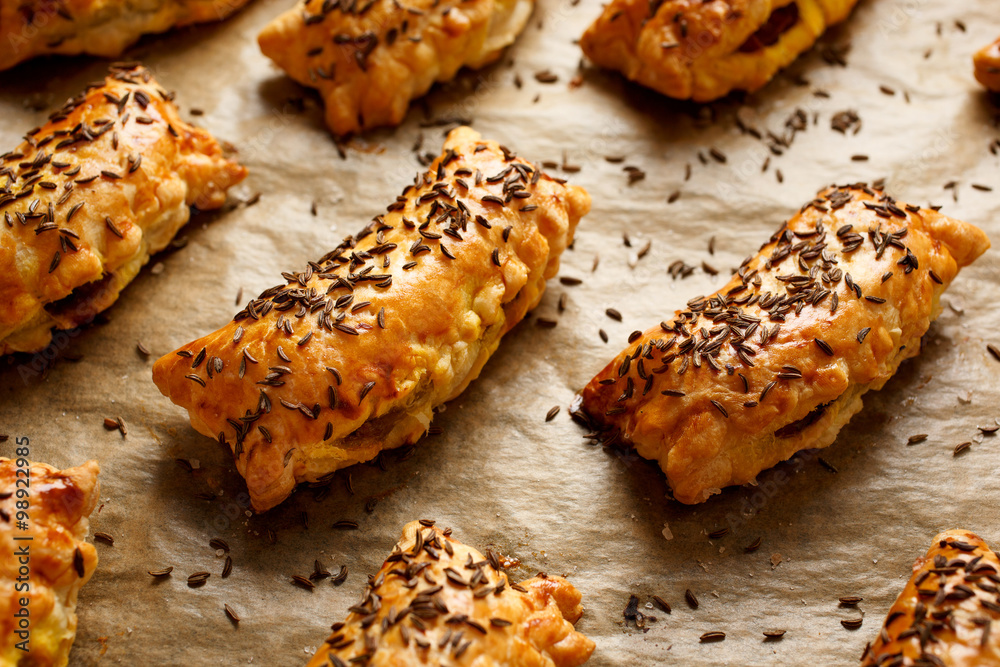 Pasties with puff pastry stuffed with cabbage and mushrooms sprinkled with caraway seeds #98922985