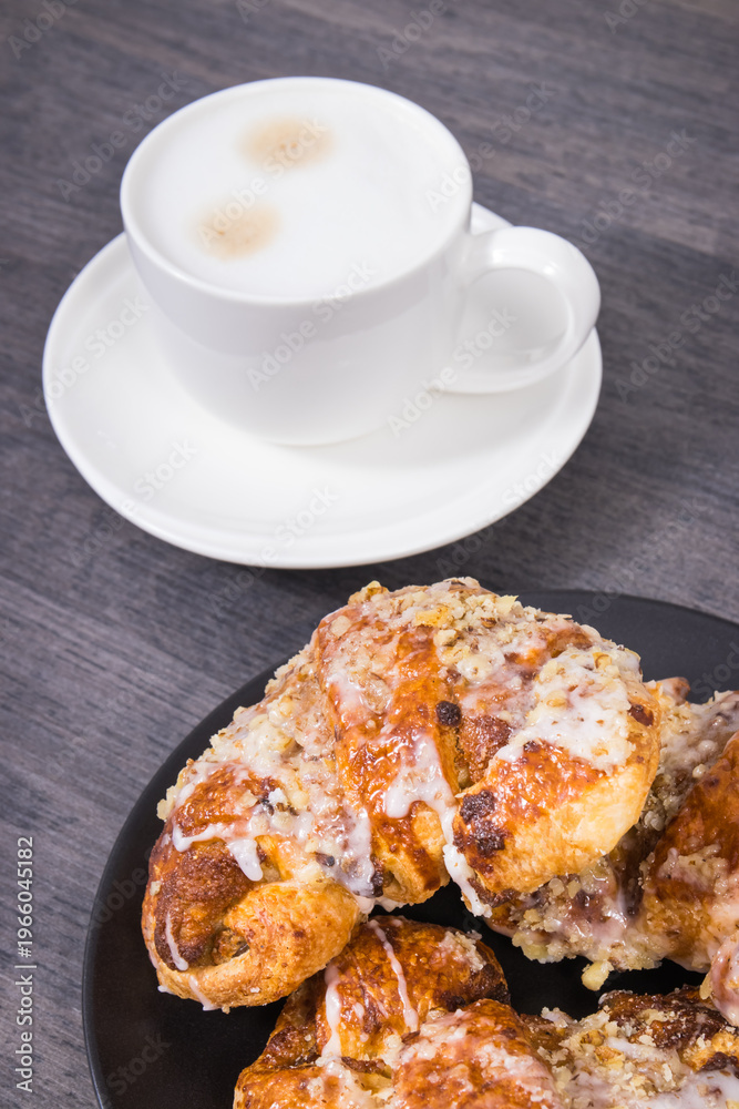 Pastry with poppy seed filing and cup of coffee. Traditional Martin's croissants from polish city Poznan #1966045182