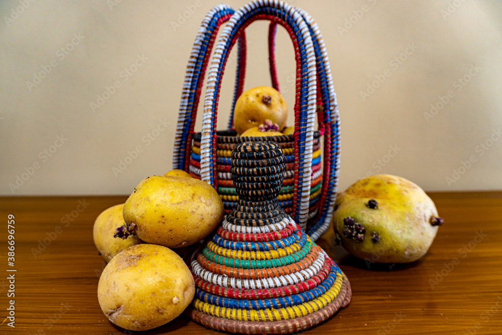 Patatas con raiz dentro de un cesto colorido africano #386696759