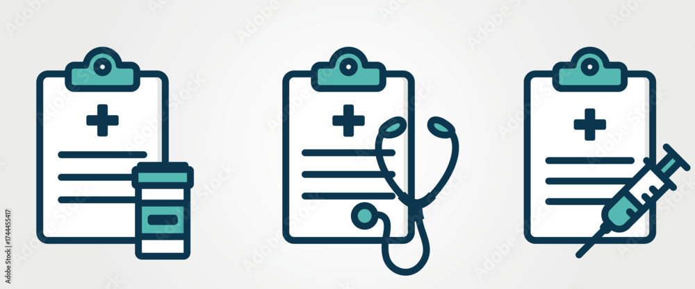 Patient report card icons. Clipboard and medical history symbols. Isolated vector color images #1744455417