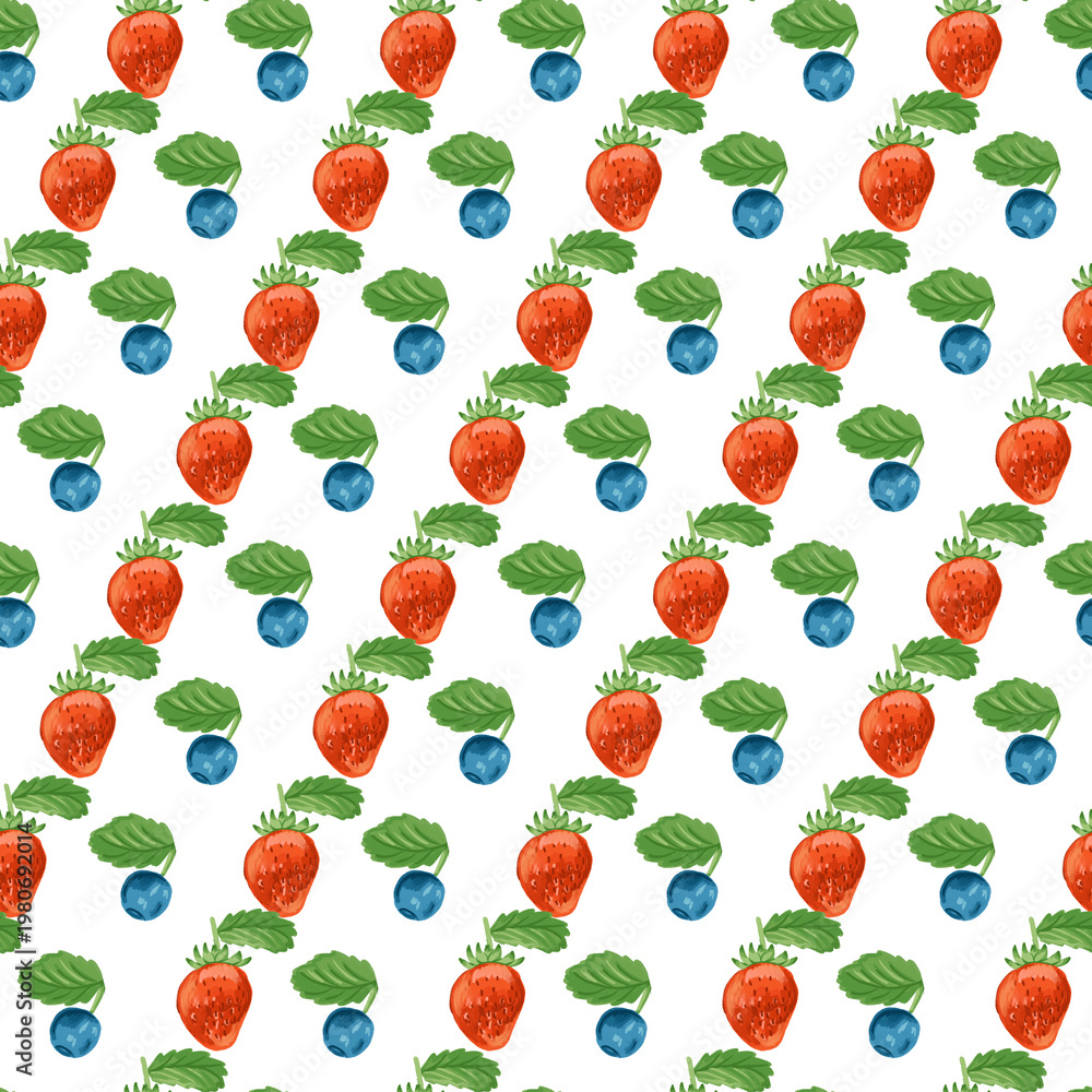 Pattern design featuring vibrant strawberries and blueberries with green leaves on a white background, suitable for textiles, wallpapers, and various decorative applications #1980692014