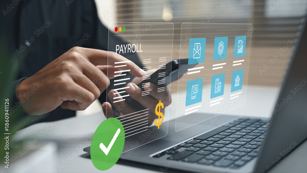 Payroll management system on digital Interface, financial technology, employee salary automation, online payroll software, and digital HR solutions. #1860941126