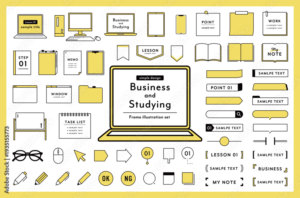 ビジネスや勉強のフレームのセット パソコン PC あしらい 飾り 仕事 イラスト ノート 本 枠 #1935155773