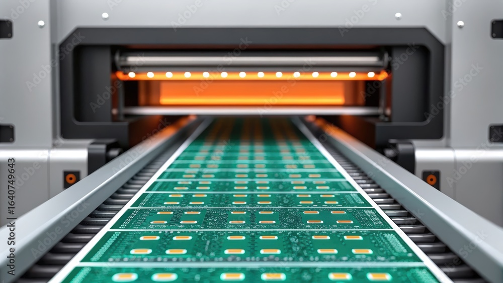 PCB assembly factory, A close-up view of a high-tech machinery conveyor system processing printed circuit boards in a modern manufacturing environment. #1640749643