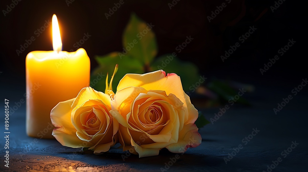 Peaceful All Souls' Day with Yellow Roses and White Candle #890601547