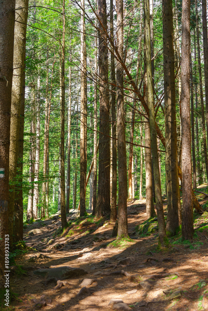 Peaceful forest trail, path surrounded by tall pine trees green moss and soft sunlight natural woodland scenery for hiking and outdoor relaxation. Summer landscape, touristic and travel destination #1898933783