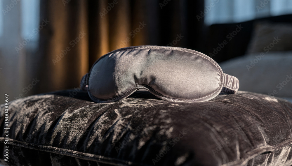 Peaceful grey silk sleep mask for rest and comfort sits on velvet pillow in dark bedroom, ready for natural, deep slumber and relaxation #1900498677