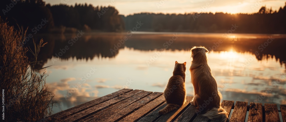 Peaceful Summer Evening with Cat and Dog on Dock by Water #1581364946