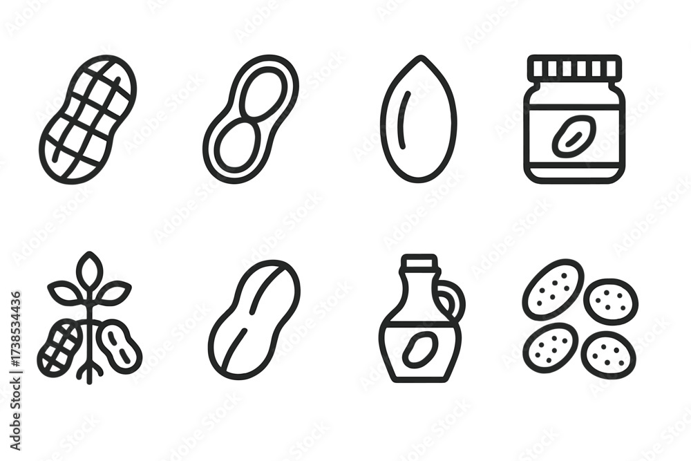 Peanut Icon Set. Outline icon set of peanuts: whole peanut, peanut shell, peanut kernel, peanut butter jar, peanut plant, peanut pod, peanut oil bottle, #1738534436